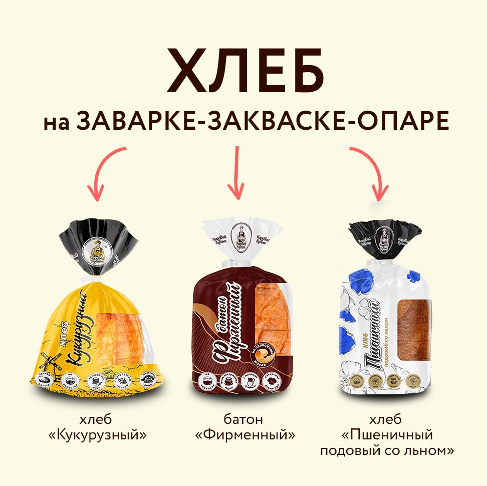 Вы встретите в нашем ассортименте: хлеб «Кукурузный» батон «Фирменный» хлеб «Подовый со льном» Попробовав их, вы почувствуете глубину вкуса, влажный эластичный мякиш и долгое послевкусие, которые может дать только настоящий многофазный способ на закваске. Мы печем не просто хлеб. Он больше, чем просто хлеб.