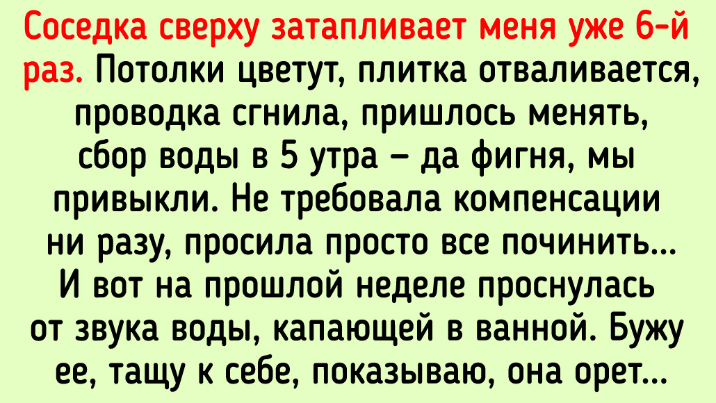 Соседка сверху затапливает меня уже 6-й раз. Потолки цветут, плитка отваливается, проводка сгнила, пришлось менять, сбор воды в 5 утра — да фигня, мы привыкли. Не требовала компенсации ни разу, просила просто все починить. И вот на прошлой неделе проснулась от звука воды, капающей в ванной. Бужу ее, тащу к себе, показываю, она орет: «А я-то при чем?» А у меня с потолка капает, и у нее на полу воды — по щиколотку. Муж орет: «Да ты знаешь, сколько я за ремонт этой дурацкой проводки заплатил?» А она на голубом глазу отвечает: «Надо лучше работать, чтобы деньги были». Вот тут я сначала дар речи потеряла. А потом взяла и вызвала сантехника штатного, тот составил акт. Нашла акты за прошлые два потопа о том, что их причина — прорыв трубы у нее и сломанный смеситель. Ну что, встретимся в суде теперь. Пусть учится лучше работать, чтобы деньги были на компенсацию. © ajdussek