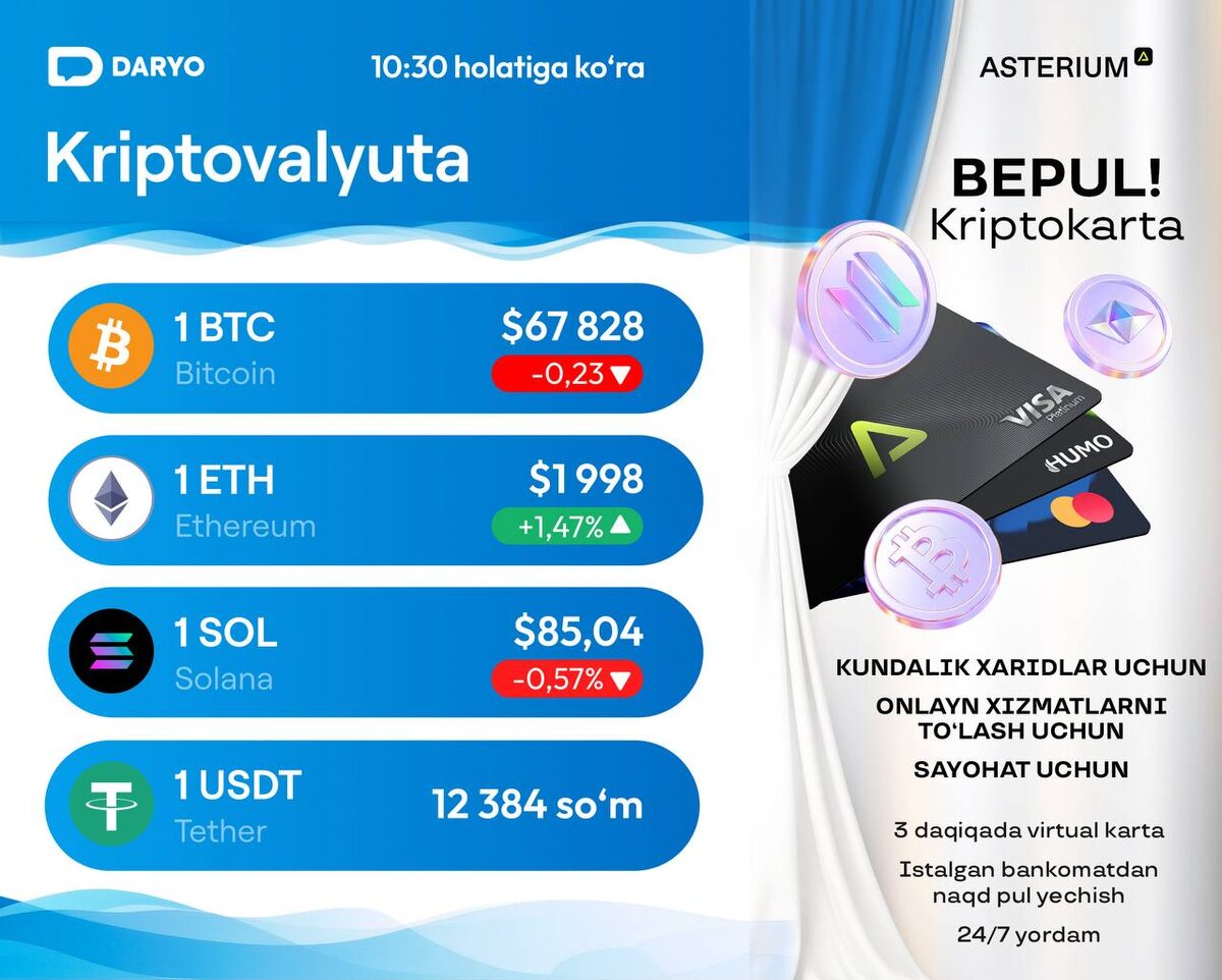 : BTC ≈ $67 828 (-0,23 %) ETH ≈ $1 998 (+1,47 %) SOL ≈ $85,04 (-0,57 %) USDT ≈ 12 384 soʻm Asterium — kriptoaktivlar kursi homiysi: kriptomagazin, kriptohamyonlar, kriptokartalar. O‘zbekiston bo‘ylab xavfsiz va qonuniy. Xizmatlar litsenziyalangan Ehtiyot boʻling: Kriptoaktivlar yuqori volatillikka ega va moliyaviy risklarni o‘z ichiga olishi mumkin! — Kriptoaktivlar O‘zbekiston Respublikasida to‘lov va to‘lovni qabul qilish vositasi emas. — Davlat tomonidan ta’minlanmagan. — Kriptoaktivlar bilan operatsiyalarni amalga oshirishda tavakkalchiliklar mavjud, ya’ni pul mablag‘lari, kriptoaktivlar evaziga almashtirilgan boshqa fuqarolik huquqi obyektlari kriptoaktivlarning narxlari o‘zgaruvchan. — Texnik nosozlik (xato)lar, qonunga xilof harakatlar, shuningdek, talon-toroj qilish holatlari oqibatida butunlay yo‘qotilishi mumkin. @daryolive