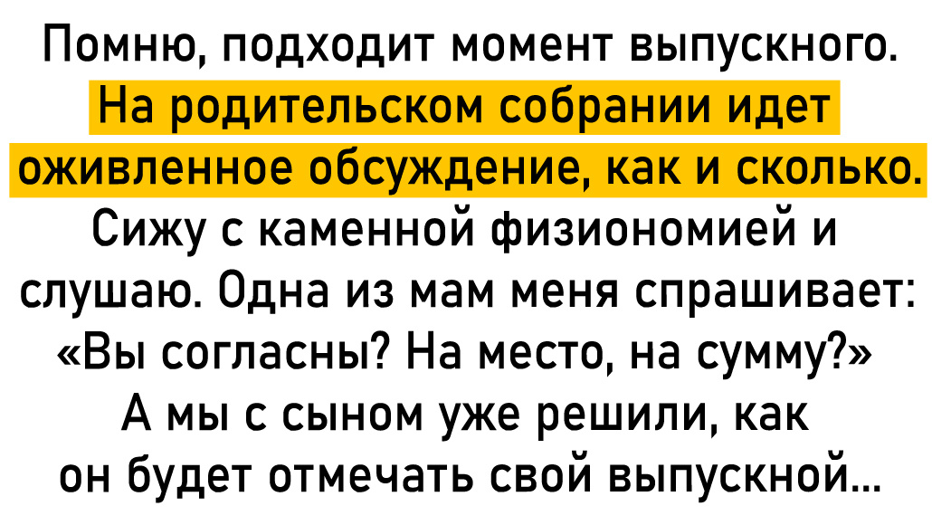 Помню, подходит момент выпускного. На родительском собрании идет оживленное обсуждение, как и сколько. Сижу с каменной физиономией и слушаю. Одна из мам меня спрашивает: «Вы согласны? На место, на сумму?» А мы с сыном уже решили, как он будет отмечать свой выпускной. С зимы прожужжал все уши, что в столицу приезжает его любимая группа. Предоставили ему выбор: или выпускной, или концерт. Два события через один день мы не потянем. И выбор был однозначный: поездка на концерт. Спросили, почему, а сын: «Да зачем мне этот ресторан, костюм и прочее. С одноклассниками, если будет желание, встретимся. А вот выступление... Группа в таком составе к нам уже не приедет». И вот съездил. Эмоций было через край. Сын свой выпускной точно запомнил. © lessan / Pikabu