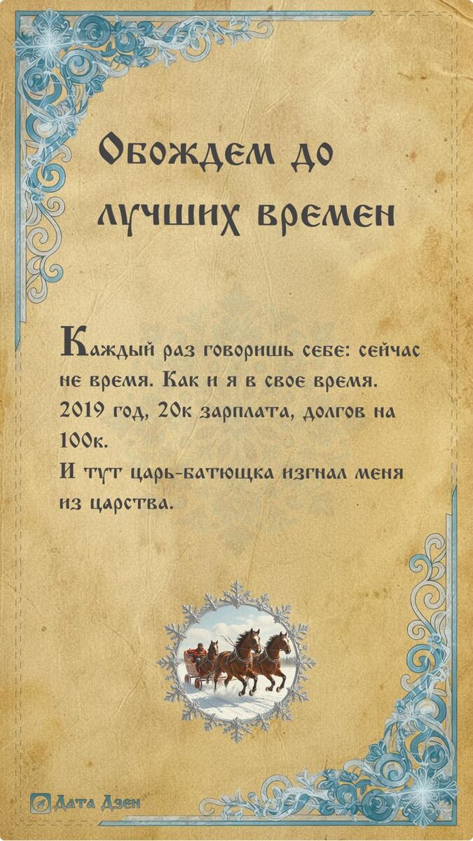 Я тоже так говорил 🤔 А наступит ли то самое время перемен? 📌 Был 2019 год Зарплата 20к, долгов на 100к. Да и жить с девушкой на что-то надо. Это точно не время для увольнения. Но так случилось, меня уволили. И пришлось срочно искать куда устроиться с опытом ТП охранной фирмы. 🎯 Словно чудо вышла на меня IT-компания Хотя какой я ITшник? Я искал позицию технической поддержки. И вот опять мысль: а сейчас не время учиться новому. Надо искать стабильности. ⚡️ Но черт меня дернул рискнуть И я встал на этот путь. Было не просто. Я вообще ничего не понимал. Сущности, алиасы, репозитории... Словно на чужом языке вещают. 🌙 Потребовалось время Я погрузился в теорию. Учил ее вечерами и ночами, а днем оттачивал практику в тестовой системе. Задавал уйму вопросов. И спустя полгода я начал уверенно себя чувствовать в этом обществе. 🚀 Спустя 6 лет я строю BI-системы, выстраиваю гипотезы, довожу автоматизации до совершенства. Хотя казалось бы, было совсем не время. 📌 Вот о чем надобно пом