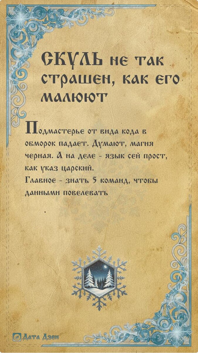 5 команд, дабы начать службу 📝 Подмастерье от вида кода в обморок падает. Думают, магия черная. А на деле - язык сей прост, как указ царский. Главное - знать 5 команд, чтобы данными повелевать. 1️⃣ SELECT - покажи мне всё SELECT * FROM kazna Команда гласит: "Покажи всё, что в казне лежит". Звездочка (*) - значит "всё без разбора". Опасно, если казна велика - компьютер может и задуматься надолго. 2️⃣ WHERE - покажи то, что мне любо сейчас SELECT * FROM kazna WHERE gold > 1000 Не тащи всё подряд. Скажи четко: "Дай мне только те записи, где золота больше тысячи". Фильтр - друг твой лучший. 3️⃣ LIMIT - возьми горсть малую SELECT * FROM kazna LIMIT 5 Чтобы не ждать вечность, возьми только 5 первых строк. Поглядеть, что там вообще лежит, да структуру понять. 4️⃣ AND / OR - условия связывай SELECT * FROM kazna WHERE city = 'Moskva' AND gold > 5000 Ищешь казну московскую, да чтоб богатая была? Связывай условия. AND - когда нужно "и то, и другое". OR - когда "или то, или это". 5️⃣ OR