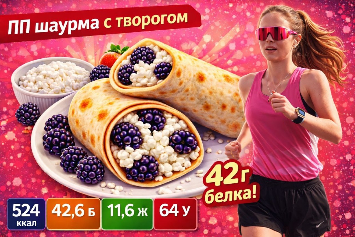 Если вам надоело есть просто творог, а белок добирать нужно — этот рецепт для вас. Готовится за 15 минут, подходит для завтрака, перекуса или после тренировки. Можно использовать любой творог и любые ягоды. Самый вкусный вариант — с вишней 🍒 1️⃣ Заранее разморозьте ягоды (за 1,5–2 часа или в микроволновке, если спешите). 2️⃣ Смешайте творог, ягоды и сахар. Сок от ягод не сливайте — он сделает начинку сочной. Количество сахара можно регулировать по вкусу. 3️⃣ Заверните начинку в лаваш. Выбирайте лаваш с жирностью не более 2 г на 100 г. Я использую «Армянский тандырный» (по 40 г лист), делю начинку на 2 части и делаю две шаурмы. 4️⃣ Выложите на противень с пергаментом. Масло не нужно. 5️⃣ Запекайте ~10 минут при 180–190°С (ориентируйтесь на свою духовку). Как только появилась румяная корочка — можно доставать. Лучше есть горячей — так вкуснее 🤍 Сохраняйте рецепт, если нужен быстрый и вкусный способ добрать белок 💪 И пишите в комментариях — сколько грамм белка в день вы обычно едите