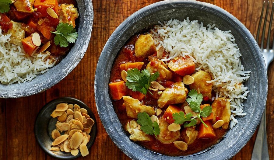 Карри с курицей и бататом — это ароматное и сытное блюдо, которое сочетает в себе нежное куриное мясо и сладковатый батат. Блюдо обычно готовится с добавлением различных специй, что придаёт ему насыщенный вкус. Ингредиенты: Приготовление: Нарежьте куриное филе на небольшие кусочки. Очистите и нарежьте лук, морковь и чеснок. Разогрейте растительное масло в сковороде. Обжарьте лук и морковь до мягкости. Добавьте чеснок и специи (куркуму и кориандр), обжаривайте ещё пару минут. Добавьте томатную пасту и хорошо перемешайте. Положите куриное филе в сковороду и обжарьте до золотистой корочки. Нарежьте батат кубиками и добавьте в сковороду. Добавьте воду или бульон, чтобы покрыть ингредиенты, и тушите под крышкой на медленном огне до готовности курицы и батата (примерно 20–30 минут). Посолите и поперчите по вкусу. Подавайте карри с курицей и бататом с рисом или лепёшками. Приятного аппетита!