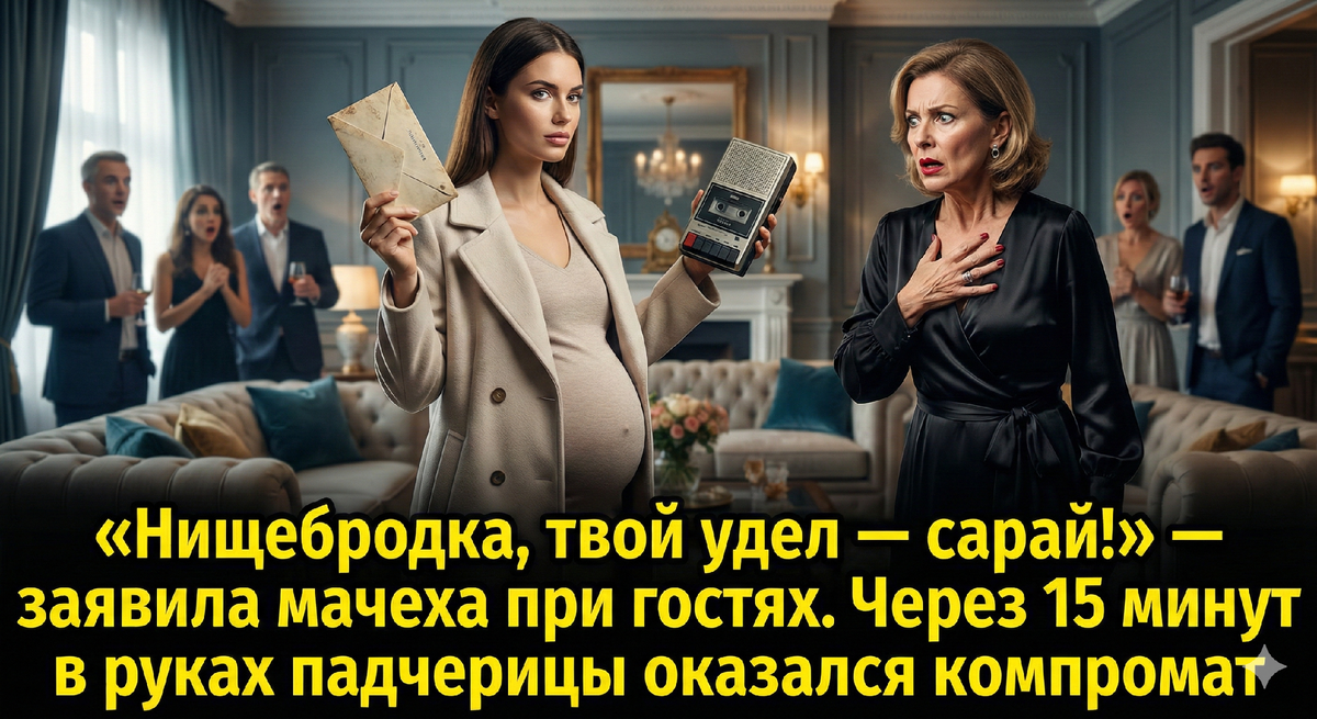 Марина стояла посреди гостиной, глядя, как рушится триумф мачехи. Оставалось всего пять минут до того момента, когда правда, скрытая в конверте, окончательно перевернёт ситуацию.