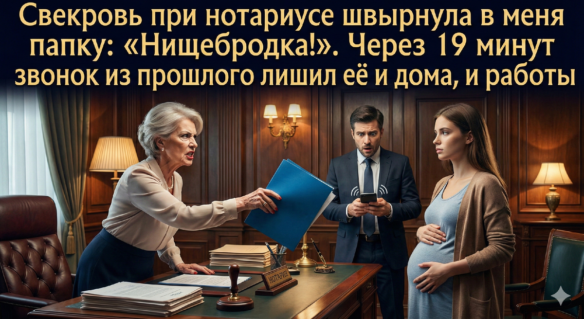 Я посмотрела на настенные часы над столом нотариуса. Секундная стрелка завершала круг. С момента, как свекровь швырнула в меня папку с оскорблениями, прошло ровно девятнадцать минут.