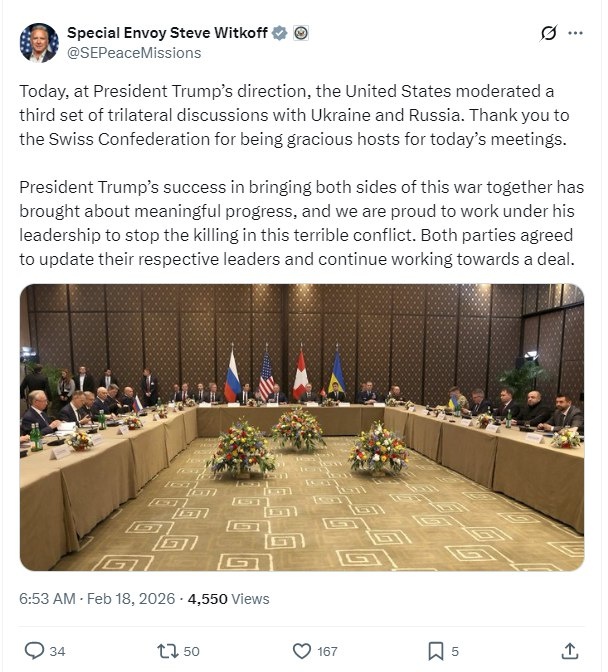 Публикация сделана по итогам первого дня дискуссий в Женева. Стороны договорились доложить об итогах своим лидерам и продолжить работу с целью достижения сделки. Уиткофф отдельно поблагодарил власти Швейцарии за предоставленную переговорную площадку. Новый раунд переговоров России, США и Украины проходит 17–18 февраля в отеле InterContinental Geneva и начнется в 11:00 мск. Дядька Гарри. Подпишись! https://max.ru/UnknownWitnessTV