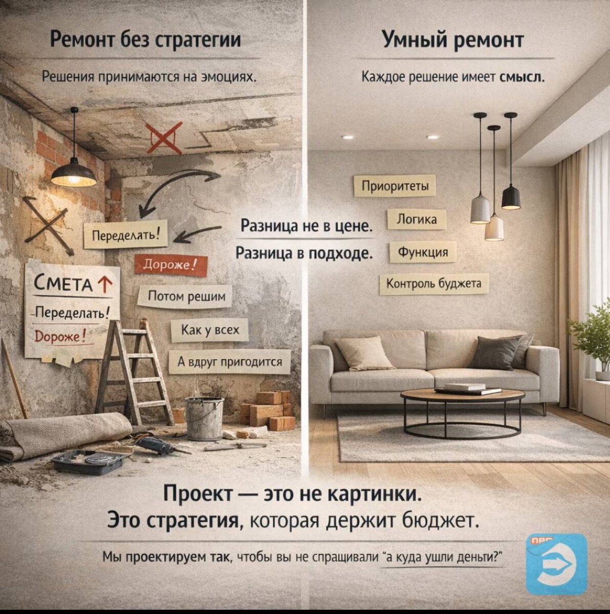 Мы много лет работаем с дизайн-проектами и ремонтами и каждый раз видим одну и ту же историю. Люди хотят сделать нормальную квартиру, не показуху, а просто удобное пространство для жизни. Но в какой-то момент бюджет начинает «плыть». Деньги уходят быстро, смета растёт, а в финале возникает логичный вопрос, а куда вообще всё ушло? И в 80% случаев проблема не в строителях и не в дизайнерах. Проблема в привычках. Разберём 10 решений, из-за которых чаще всего происходит переплата. 1️⃣Платить за бренд, а не за функцию. Смесители, свет, техника, сантехника. Громкое имя, красивый шоурум и кажется, что это автоматически лучше. Иногда да. Но часто вы платите за маркетинг. Важно понимать: вы платите за реальную функцию или за ощущение статуса? 2️⃣ Делать идеальную отделку там, где она не нужна.