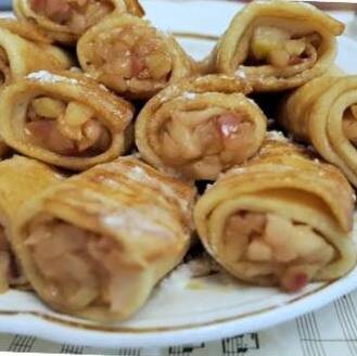 1. На край блина (подрумяненной стороной вверх, если одна сторона красивее) выложите 1–1,5 столовые ложки остывшей яблочной начинки.
