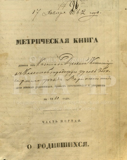 Метрические книги о рождении, браке и смерти за 1861 г. ГИА Чувашской Республики (ГИА ЧР), фонд № 225, опись № 3, дело № 130, стр. 2391 скан. Метрическая книга, данная из Казанской духовной консистории в Казанскобогородицкую церковь Чебоксарского уезда Мариинского Посада для записки родившихся, браком сочетавшихся и умерших, на 1861 год. Часть первая. О родившихся. Стр. 2442 скан. Декабрь. № 61. 23 числа родилась. 24 числа крещена. Евгения. Родители: Мариинского Посада 3-й гильдии купец Григорий Осипов Бандин и законная жена его Евдокия Петрова, оба православного вероисповедания. Восприемники: Мариинского посада 3-й гильдии купца Григория Осипова Бандина сын Василий и онаго же посада мещанина Петра Осипова Бандина жена Матрена Ефремова. Таинство крещения совершил Феофан Скарабевский. Диакон Константин Хотинский. Дьячек Александр Васильев Сироткин. Пономарь Прокопий Борисов. https://yandex.ru/archive/catalog/8cd18d20-ddcd-4362-9550-a30ace777630/2442
