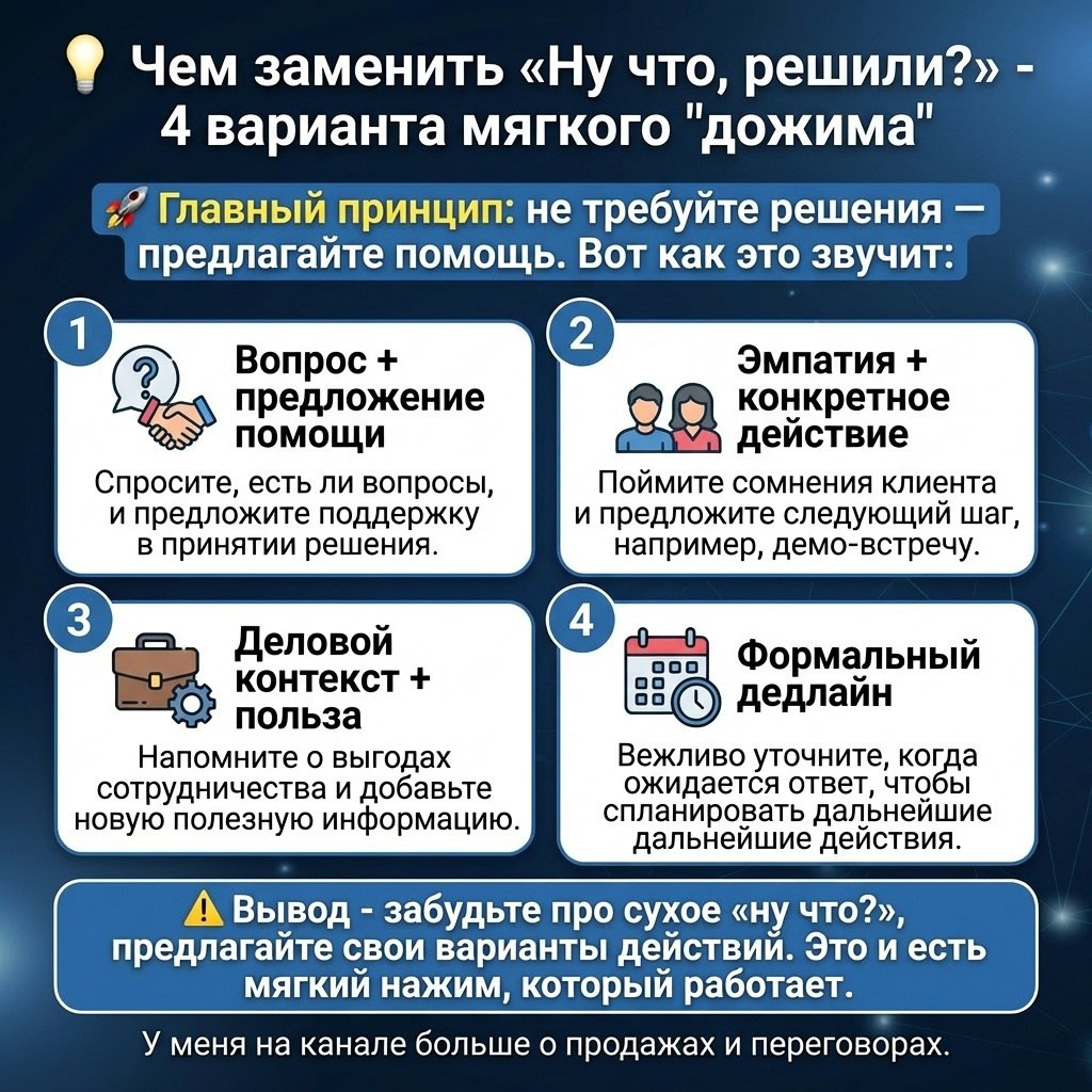 " Ранее я рассказал, почему фраза «Ну что?» раздражает клиентов. Сегодня расскажу - что писать вместо нее, чтобы получать ответы без негатива. 🚀 Главный принцип: не требуйте решения — предлагайте помощь. Вот как это звучит: 1️⃣ Вопрос + предложение помощи «Здравствуйте! Как продвигается обсуждение нашего предложения? Может быть, у вас возникли вопросы, на которые я могу ответить?» Что здесь хорошо: вы и интересуетесь ходом обсуждения, и сразу даете возможность задать вопросы. Не давите, а помогайте. 2️⃣ Эмпатия + конкретное действие «Добрый день! Я понимаю, что решение непростое. Если нужно, я могу подготовить дополнительные расчеты или встретиться с вашим руководством, чтобы все подробно объяснить». Вы демонстрируете готовность участвовать в принятии решения, а не просто ждать у моря погоды. 3️⃣ Деловой контекст + польза «Коллеги, хотели уточнить, на какой стадии рассмотрение? Нам важно спланировать ресурсы. Если потребуется дополнительная информация, дайте знать, мы с рад