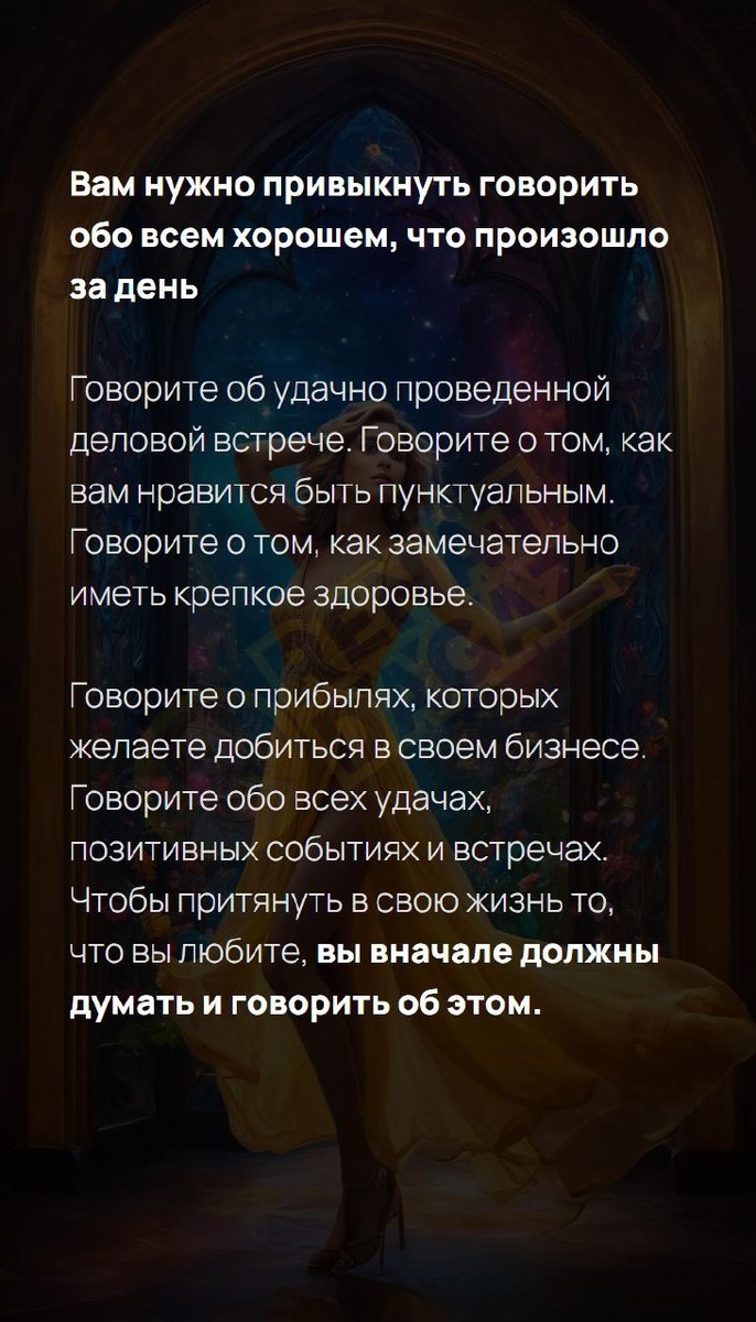 Вам нужно привыкнуть говорить обо всем хорошем, что произошло за день Говорите об удачно проведенной деловой встрече. Говорите о том, как вам нравится быть пунктуальным. Говорите о том, как замечательно иметь крепкое здоровье. Говорите о прибылях, которых желаете добиться в своем бизнесе. Говорите обо всех удачах, позитивных событиях и встречах. Чтобы притянуть в свою жизнь то, что вы любите, вы вначале должны думать и говорить об этом. Архитектура вашей души | Ваш Ангел и Демон T | VK | Pin | YouTub | Dzen #исцеление #денежныйпоток #простыерадости #важное #саморазвитие #результат #радость #спокойствие #позитив #18число #18февраля