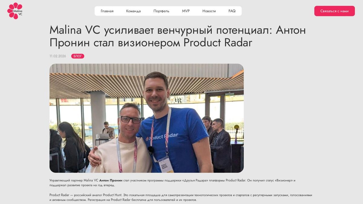 ! Радаровцы! У нас в сообществе произошло важное событие! Управляющий партнер фонда Malina VC Антон Пронин стал «Визионером» программы поддержки Product Radar. Став участником программы «Друзья Радара», Антон Пронин @circlepronin подчеркнул: Я считаю своей миссией развивать инновации в стране и в мире, развивать венчурный потенциал. Это то, чем будут пользоваться мои дети и другие люди. Для меня это важнейшая часть нашей эволюции. На Product Radar много начинающих компаний, и они раньше других чувствуют изменения рынка, поведения пользователей и спроса. Мне интересны этот опыт и знания, поэтому я поддерживаю их раннее развитие через “Радар”. Поддержка ключевых фигур и организаций из мира российского венчура – это сигнал, что Радар доказал свою ценность, как инфраструктура ранней стадии. Ресурсы из программы поддержки направляем на развитие площадки и ее инструментов для действующих и будущих резидентов. 🚀 Хотите, чтобы сильные команды быстрее находили ресурсы для роста? Поддержи