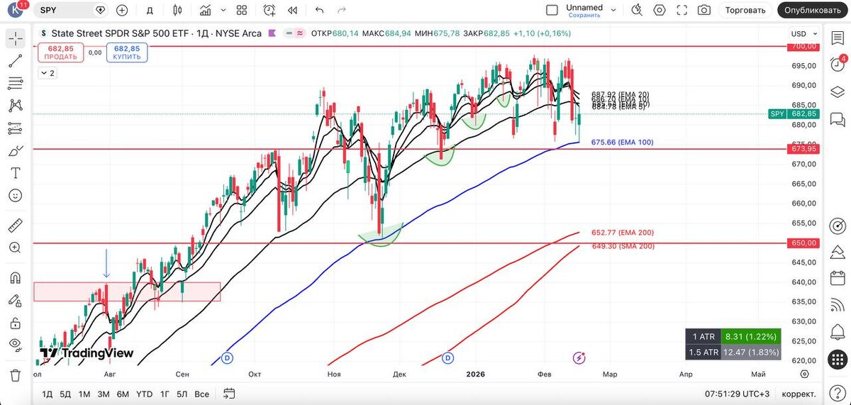 Понаблюдаем за $MAGS и его 200 EMA D - 200 SMA D, и что нарисует $SPY на 20 EMA W. А пока что мысли не изменились: скользящие сверху могут выступить сопротивлениями. $QQQ, $IXIC, $XLK зависли в воздухе — не исключаем снижение до 200 EMA D, а также учитываем, что $VIX находится в «бычьем» тренде и пока что не дает явных подсказок. #spy #технический_анализ #америка #трейдинг_сша #фондовый_рынок #обзор #вывод #qqq #vix #smh #mags #xlk #ixic