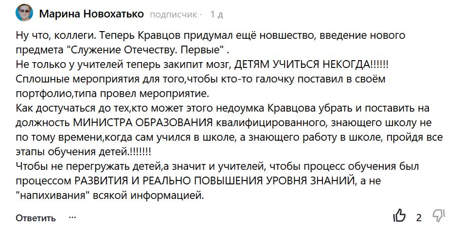 И подписчики порой прямо негодуют по поводу работы минпроса и его руководителя, уважаемо-непотопляемого министра. Пишут откровенно, потому что простыми словами не выразить весь кошмар, в который погрузили школы времен кравцова.