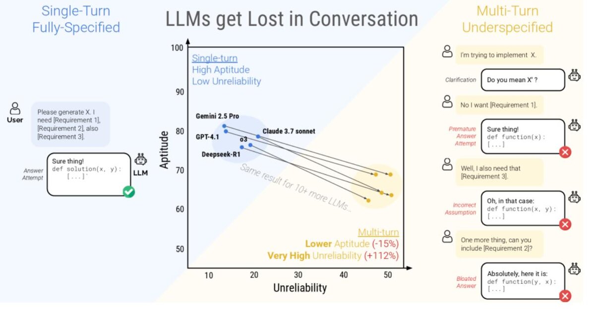 ⚡️ Microsoft Research и Salesforce проанализировали 200 000+ диалогов с ИИ и подтвердили то, о чём многие догадывались