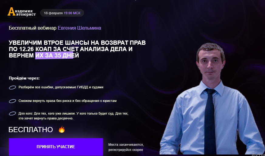 Как бесплатно вернуть права за отказ по 12.26 КоАП? Да все просто - надо как минимум разобраться со своим делом, найти все возможные зацепки и для этого совершенно никому не нужно платить деньги! Я провожу бесплатный вебинар на котором расскажу как вернуть права. Как увеличить шансы на возврат на любой стадии и с любой сложностью. Думаете, что ваше дело уникально? Разберу такое же как у вас и десятки других вариантов всего за один час!
