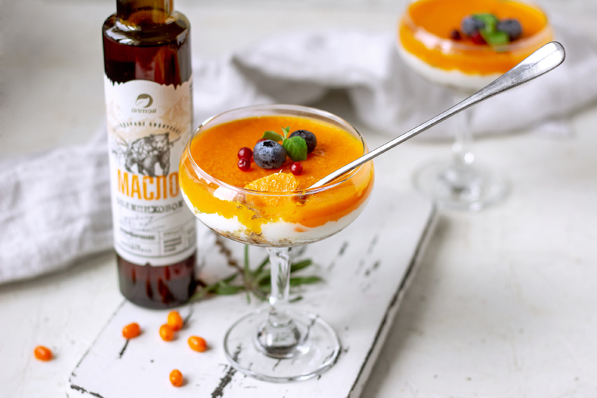 5. Ягоды облепихи обдать кипятком, протереть через сито, удалив косточки и кожицу. 6. Желатин высыпать в стакан, залить небольшим количеством воды (до 50 мл), растопить, не допуская закипания. 7. Смешать пюре (сок) мандарина, облепихи и желатин. 8. Рикотту выложить в отдельную ёмкость и смешать с подсластителем (например, "Фитпарад" 3-4 пакетика). 9. Взять стаканы или креманки с широким дном, уложить на дно слой овсяно-ореховой смеси толщиной около 1 см, плотно утрамбовать (ложкой или пестиком). 10. Выложить слой рикотты толщиной в 1,5 -2 раза больше, чем первый слой. 11. Сверху залить смесью соков с желатином (примерно равной по толщине слою рикотты) и убрать в холодильник на 30-60 минут. 12. Перед подачей десерт можно украсить свежими ягодами. Хранить в холодильнике. ПРИЯТНОГО АППЕТИТА