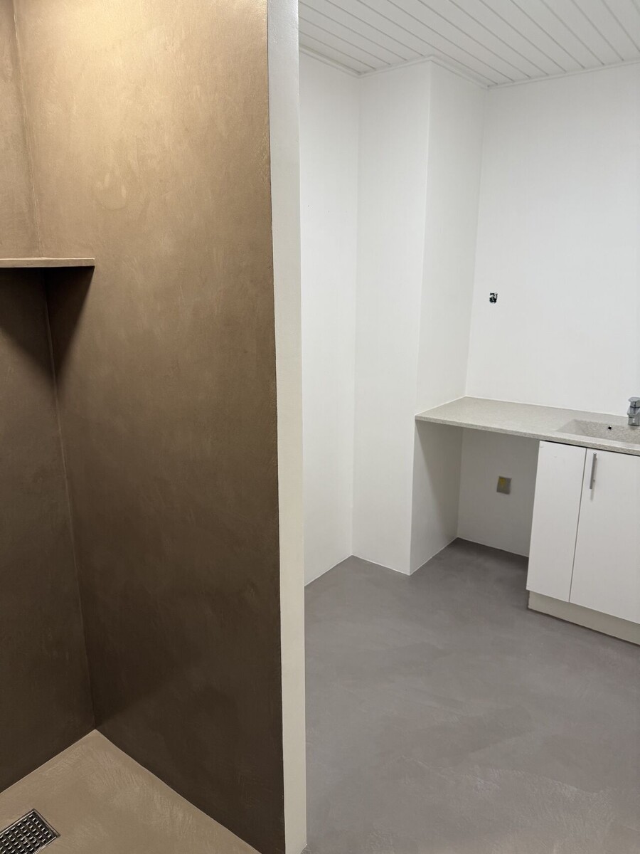 При проектировании ванной комнаты важно учитывать не только эстетику, но и эксплуатационные характеристики материалов. Повышенная влажность, перепады температуры, регулярный контакт с водой и бытовой химией предъявляют к отделке особые требования. Именно поэтому микроцемент и системы на его основе сегодня активно применяются в санузлах. Главное преимущество такого решения — цельная поверхность без швов. В отличие от плитки, где слабым местом часто становятся межплиточные швы, декоративная штукатурка под бетон формирует монолитное покрытие. Это снижает риск накопления влаги и упрощает уход. Визуально микроцемент создает спокойную, архитектурную поверхность с легкой фактурой. Пространство выглядит современно и лаконично, без перегруженности деталями. Особенно выигрышно такое покрытие смотрится в небольших ванных, где важно сохранить ощущение воздуха и целостности. Для подобных проектов используется система на основе Штукатурки Арт бетон Polycement с последующим нанесением protector и PU2