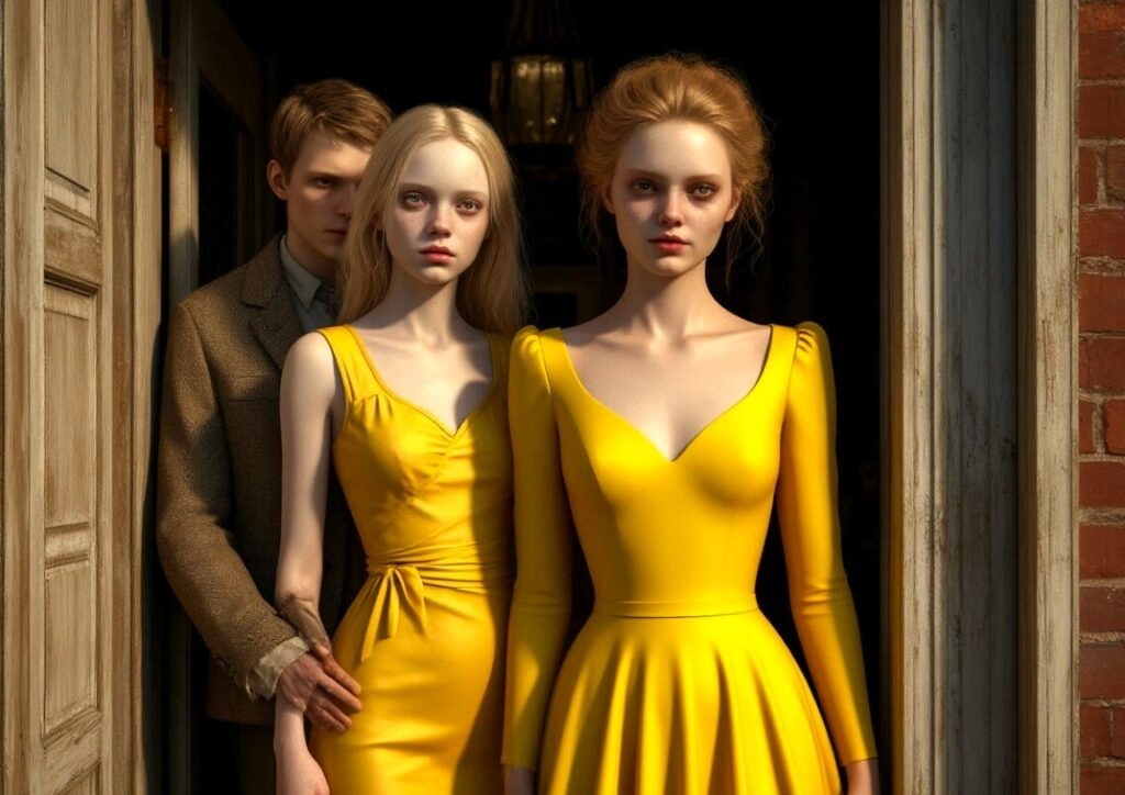 На пороге стояла высокая женщина в ярко‑жёлтом платье. Улыбка — широкая, ослепительная, но в глазах что‑то жёсткое, неживое. Рядом — бледная девушка лет семнадцати, глаза пустые, как у человека, который давно не спал. А за их спинами — маленький сутулый мужчина. Он не поднимал взгляда, теребил край потрёпанного пиджака.