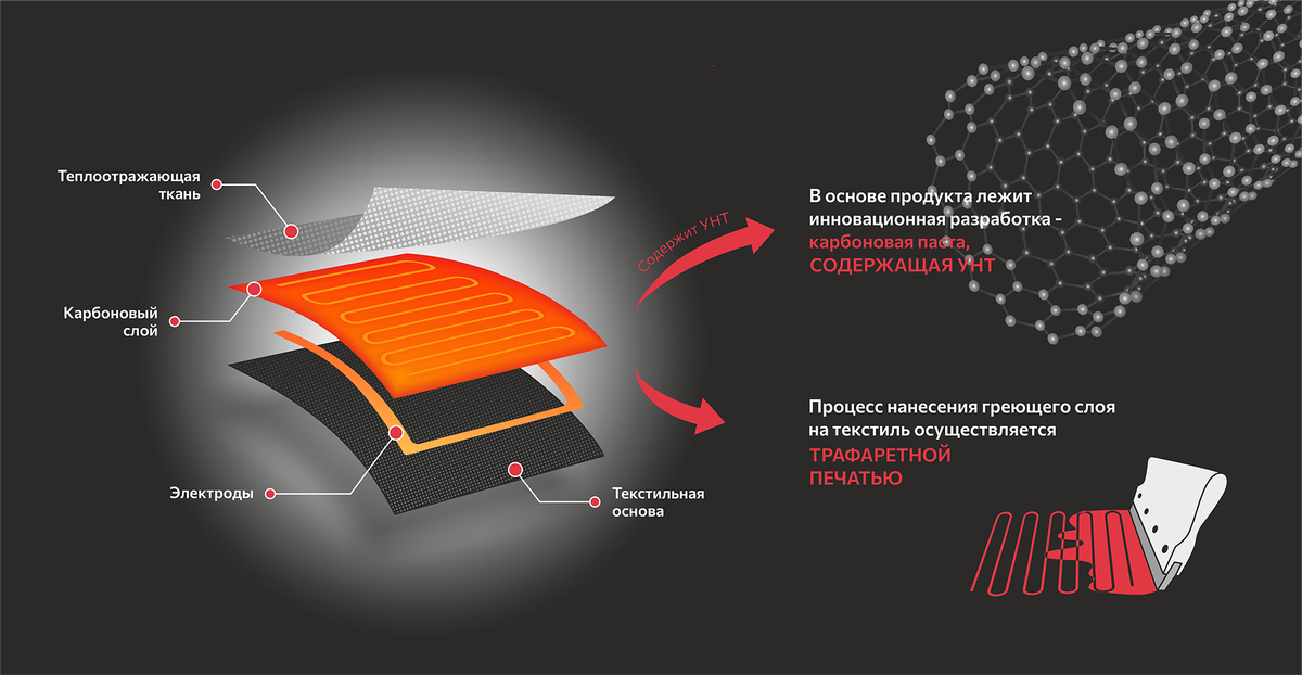 Компания «Бодихит» (проект ЦНН РМ) разрабатывает инновационные текстильные нагревательные элементы на основе современных наноматериалов. Эти решения открывают новые возможности для создания подогреваемой одежды, туристического снаряжения и текстильных изделий с «умными» функциями. Основой продукции служит карбоновая растягиваемая паста, содержащая углеродные нанотрубки и мелкодисперсный графит. Она обладает положительным температурным коэффициентом, что гарантирует безопасность эксплуатации и исключает риск перегрева. Нагревательные элементы отличаются рядом ключевых характеристик:
