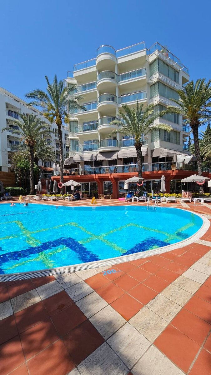 * Это отель, где дни проходят под шум прогулок по набережной, а ночи продолжаются в барах у моря или у бассейна с любимым коктейлем🍹 Подборка с выгодными датами ⭐️Фишки отеля: ▪️Городской отель - на первой пляжной линии с одной стороны и яркой курортной жизнью с другой. ▪️Один из немногих отелей в Мармарисе, работающих в сезон на "все включено". 📎Детали: 🔸Компактная территория может похвастаться собственным выходом на набережную Мармариса, где можно сразу начинать тусить. 🔸В большом бассейне любят отдыхать семьи с детьми, у тихого бассейна собирается молодежь - здесь царит барная атмосфера. 🔸Основной ресторан и 2 а-ля карта с любимыми турецкими блюдами - сочными кебабами и свежей рыбой на гриле, 5 баров. 🔸Досуг - для фито-няшек есть тренажерный зал, хаммам и сауна, спортивные активности. 🔸Для детей - мини-клуб, бассейн, площадка и игровая комната. 🔸Ненавязчивая анимация в течение дня, по вечерам тематические вечеринки и ди-джей сеты. 🔸Пляж из песка и гальки буквально в паре