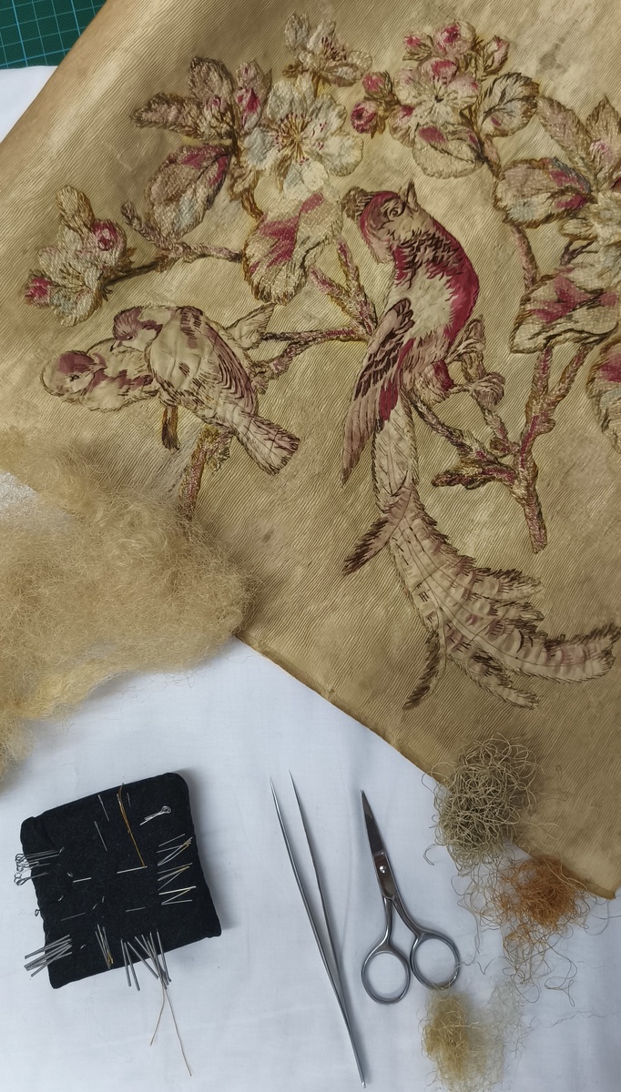 Сегодня расскажем вам об особенностях работы с вышивкой на ширму. Ранее мы уже писали об истории происхождения подобных предметов интерьера. В собрании Музея-заповедника «Остров-град Свияжск» имеется три фрагмента вышивки на ширму, изготовленные в одной стилистике, но на разных тканых основах (золотистый шелк и шелк малинового цвета) и с разными мотивами вышивки. Остановимся подробно на процессе реставрации одного из элементов данного комплекса. Основой полотна данной вышивки служит ткань с аппликациями из хлопка и шёлка. На тканой основе представлена аппликация с растительным и зооморфным сюжетом. Аппликация была выполнена из хлопчатобумажной ткани и из жаккарда с использованием шелковых нитей. Дополнительно аппликация на вышивке имеет декорирование красочным слоем. Как и многих предметов быта сохранность панно на ширму имеет различные разрушения. Например, со временем в некоторых местах были утрачены нити вышивки на аппликации, имелись многочисленные сечения основы, разрывы ткани, ут