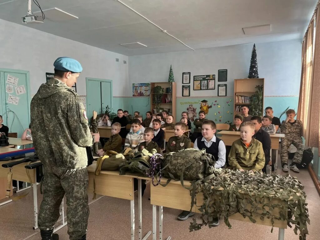 Юнармейцы военно-патриотического клуба «Прометей» провели для младших школьников — наших будущих защитников, увлекательные уроки военной подготовки. Ребята смогли не только увидеть, но и прикоснуться к военной амуниции, средствам маскировки и химзащиты, а также муляжам огнестрельного оружия.
