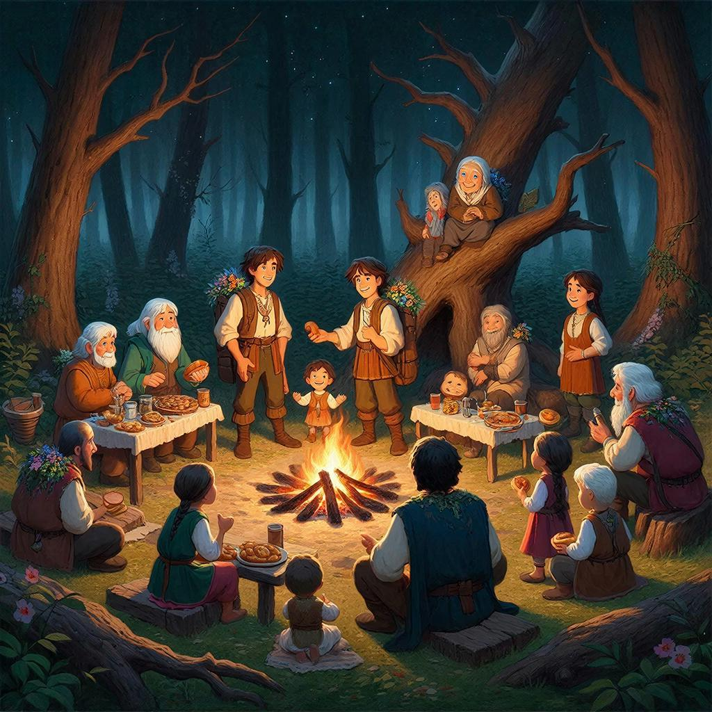 Там было всё. Столы, ломящиеся от угощений. Мерилианцы в ярких одеждах, с цветами в волосах. Дети, бегающие с пирожками в руках. Старики, сидящие в кружок и рассказывающие истории. И над всем этим — огромный костёр, который горел так ласково, что хотелось подойти и обнять его.