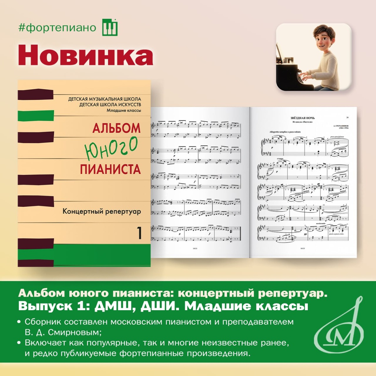 Выпуск 1. Редактор-составитель В. Д. Смирнов Альбом юного пианиста — не просто очередной сборник для младших классов, а тщательно отобранный концертный репертуар для начального периода обучения. Его принципиальное отличие — ориентация не на выполнение программных требований как таковых, а на сценическую задачу: каждая пьеса предполагает публичное исполнение и формирует у ребёнка ощущение законченного художественного высказывания. 🟢В альбом включены сочинения разных эпох и стилей — от барочных и классических миниатюр до романтических и современных пьес. Среди авторов И. Маттезон, Г. Ф. Гендель, В. А. Моцарт, Ф. Шуберт, Ф. Мендельсон, К. М. фон Вебер, И. Альбенис, А. Верстовский, А. Гречанинов, С. С. Прокофьев и другие композиторы, чьи произведения традиционно формируют основу детского концертного репертуара. Обнаруженный в 2024 году в Нью-Йоркской библиотеке Вальс Ф. Шопена представлен впервые, некоторые сочинения редко исполняемы или являются переложениями. Важно, чтобы ребёнок с пе