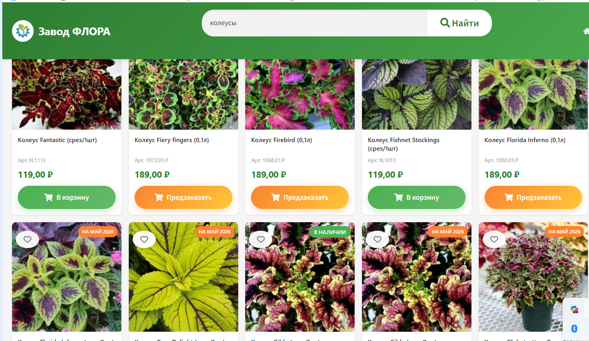Сегодня решила провести небольшую фото-экскурсию по каталогу нашего кемеровского питомника ЗаводФлора. Выращивают там и продают декоративные растения, в основном из черенков. Наименований тьма тьмущая. Выбрала колеусы: И теперь захотелось разглядеть красивое разнообразие вегетативных колеусов. И подумать: может, и не надо нам выращивать из семян? Может, лучше пойти в местный питомник или к продавцу на Авито и купить готовые, выбрать? Или это в копеечку влетит? Смотрим! Итак! Мы сразу видим цены: Срезы у них хорошие. Я брала калибрахоа, сама укореняла, все прижились. Возможно, на Авито, у коллекционеров дешевле. Но я еще в прошлом году там смотрела, ассортимент невелик, и ни один колеус с Авито мне не приглянулся. А тут взгляд кое за какие зацепился. ✅Колеус Bonnie Gold. Не скажу, что "Вау!", и не куплю, для меня бледноват. Но вот эта каемочка по краю листа делает сорт уникальным и особенным. ✅Колеус Caracas. Поярче, но сильно темный. Посмотреть интересно, но выращивать не стала бы. Из