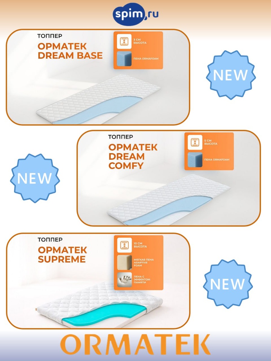 !!! 🔥Встречайте обновление в категории топперов от бренда Oрматек. Три новые модели, созданные для вашего комфорта и здорового сна. 🔹 Ormatek Dream Base Односторонний мягкий топпер на основе современного материала Ormafoam. 📏 Высота: 3 см 🔹Ormatek Dream Comfy Односторонний средне-жесткий топпер на основе современного материала Ormafoam. 📏 Высота: 5 см 🔹Ormatek Supreme Состав топпера: -Пена Memorix с эффектом памяти, обеспечивает расслабление и повышенный комфорт. Он принимает форму, идеально повторяющую очертания тела, снимает нагрузку и предотвращает обратное давление. Помогает быстрее расслабиться и крепче спать; -Пена Adaptive Foam. Упругая латексоподобная пена, отличается повышенной комфортностью, долговечностью. 📏 Высота: 10 см ✅ Все топперы гипоаллергенны, просты в уходе и подходят для любых типов матрасов. ✨Сон — это маленькая жизнь, и каждый её миг должен быть комфортным.