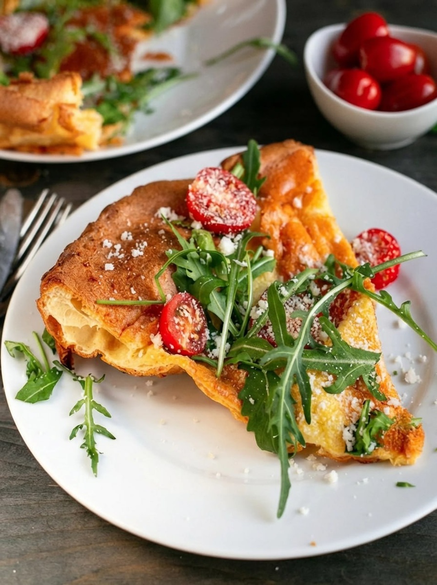 ) Для тех, кто хочет блинов, но не хочет стоять у плиты и жарить бесконечные тонкие блинчики — есть идеальный вариант: один большой и пышный блин в духовке. Этот «голландский малыш» печётся почти без участия человека. Вам останется только нарезать и добавить начинку. ⌛️ 25–30 минут в духовке Вам понадобится: Для блина Молоко — 100 мл Яйцо куриное — 3 шт. Мука пшеничная — 70 г Соль — ½ ч.л. Топлёное или растительное масло — 1,5 ст.л. Для начинки (вариант) Помидоры черри — 100 г Твёрдый сыр (Пармезан / Грюйер / Пекорино) — 20 г Руккола — 20 г 1️⃣этап Разогрейте духовку до 190 °C и сразу поставьте в неё чугунную сковороду (или другую толстостенную, подходящую для духовки), чтобы она хорошо прогрелась. 2️⃣этап Ингредиенты 2-го этапа: Молоко — 100 мл Яйцо куриное — 3 шт. Мука пшеничная — 70 г Соль — ½ ч.л. Соедините яйца, молоко, муку и соль. Тщательно размешайте до гладкости — получится жидкое тесто, похожее на обычное блинное. 3️⃣этап Ингредиенты 3-го этапа: Топлёное или растител
