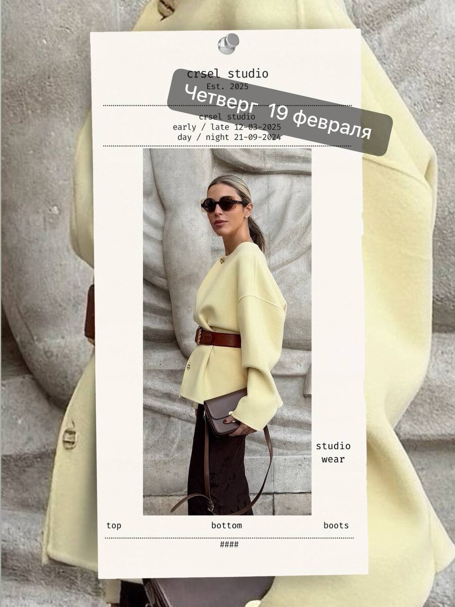 День Юпитера • Луна из Рыб в Овне • Аркан Солнце С утра мягкость, ближе к вечеру — энергия и проявленность. Цвет дня (Юпитер) — жёлтый и коричневый: карамельный, горчичный, песочный, золотистый. Можно добавить красный акцент к вечеру. По вещам — простые, но выразительные формы: костюм, платье, рубашка. Детали: золото, ремень, яркая сумка. Образ — уверенность и расширение.