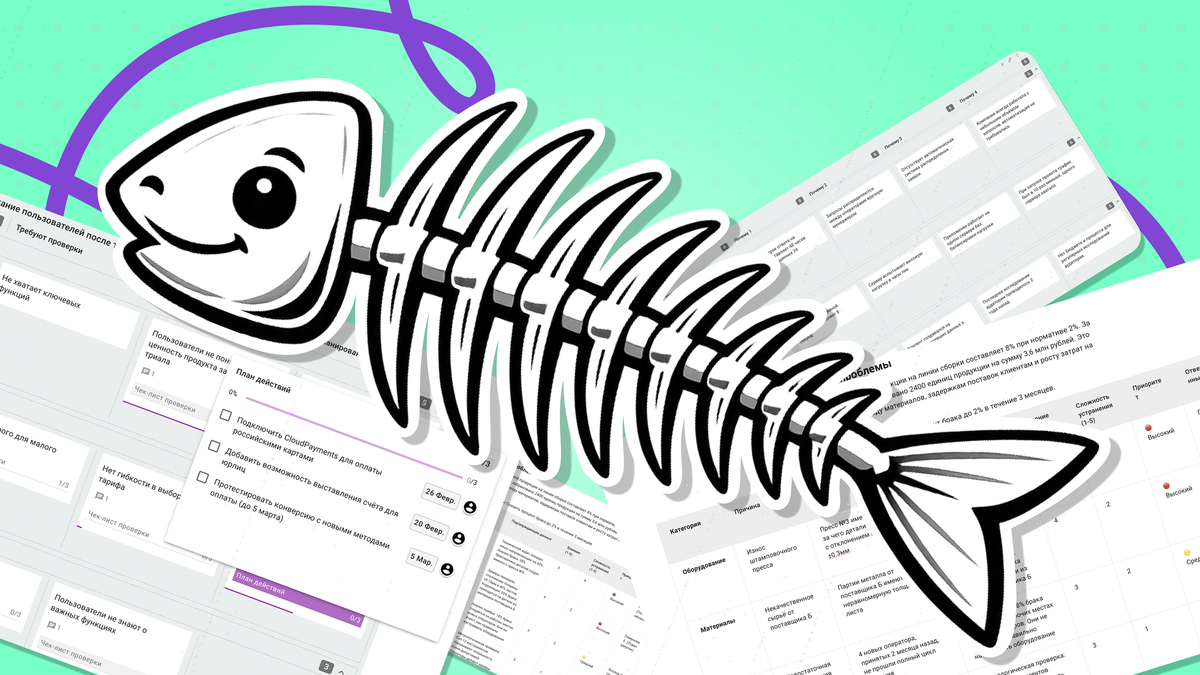 Традиционно «рыбью кость» рисуют на доске или в редакторах схем. Мы перенесли этот принцип в рабочую среду Kaiten и создали набор шаблонов, которые интегрируют метод в канбан-доски и документы.