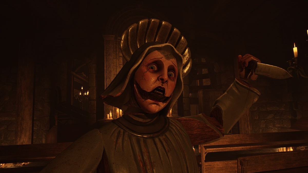 Врагов всего несколько видов: обычные идолы, раздваивающиеся усиленные статуи, летающие херувимчики-снайперы, живые турели и лавкрафтовские амфибии. По сути, пугают и создают проблемы только последние: они внезапно выскакивают из картин в тёмных подземельях и стремительно атакуют. Остальные, включая боссов, слишком медлительны, поэтому у них редко получается сократить дистанцию до протагониста. В ближнем бою идолы делают резкие выпады в духе Silent Hill f, которые можно парировать ножом. Но зачем так рисковать, если легче расстрелять болванчиков издалека или на крайний случай в упор?