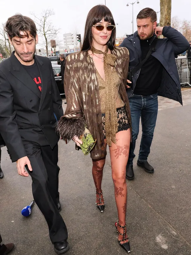 Сижу, листаю ленту, и тут — она. 35-летняя Дакота Джонсон идет по Парижу. А на ней... Ну, как бы это помягче сказать... кружевной низ. То есть, юбки или брюк нет. Совсем. Конечно, этот образ многим не понравился. Но почему когда какая-нибудь 20-летняя модель так выходит, все говорят: «Ах, какая смелость, какой эпатаж!». А когда так одевается женщина за 30, то первая реакция у многих — «Стыдоба!», «Возраст не тот!», «Куда катится мир?». Давайте честно — увидев такое фото, вы бы пролистали мимо? Или всё-таки остановились бы со словами «Ну надо же...»? Вот и я остановилась. То, что на Дакоте, модные журналы вежливо называют «микро-шорты». Шорты? Вы серьезно? Как по мне, это просто черное кружево, и от шорт там только «микро». Но знаете, что спасает весь этот образ от фривольности? Одна маленькая деталь — колготки с деликатным узором. И вот этот нюанс переводит наряд из категории «забыла юбку» в категорию «высокая мода». Самое интересное в этом образе — дикий контраст. Если снизу у нас пра