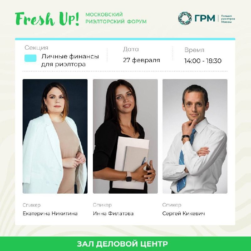Если доходы нестабильны — значит, система особенно важна. Об этом — второй блок секции. 🗣 Екатерина Никитина Генеральный директор АН PRO Обмен Бизнес-наставник, декан Академии развития РГР 📌Тема: «Личный бюджет риэлтора: как планировать, если доходы нестабильны?» Для риэлторов, которые хотят заменить хаос на понятную и работающую систему. 🗣 Инна Филатова Главный редактор проекта «Культура-денег.рф» Сертифицированный финансовый консультант, МВА, экс-Сбер 📌 Тема: «Финподушка для риэлтора: как создать уверенность в завтрашнем дне?» Для тех, кто хочет чувствовать свободу, спокойствие и опору, а не зависимость от следующей сделки. 🗣 Сергей Кикевич Независимый финансовый советник, специалист по личным финансам и инвестициям. Председатель совета Национальной ассоциации специалистов финансового планирования (НАСФП). 📌 Тема: «Инвестиции для риэлтора: куда вложить, чтобы не потерять?» Для тех, кто хочет разобраться в понятных инвестиционных инструментах, сохранить капитал и создать