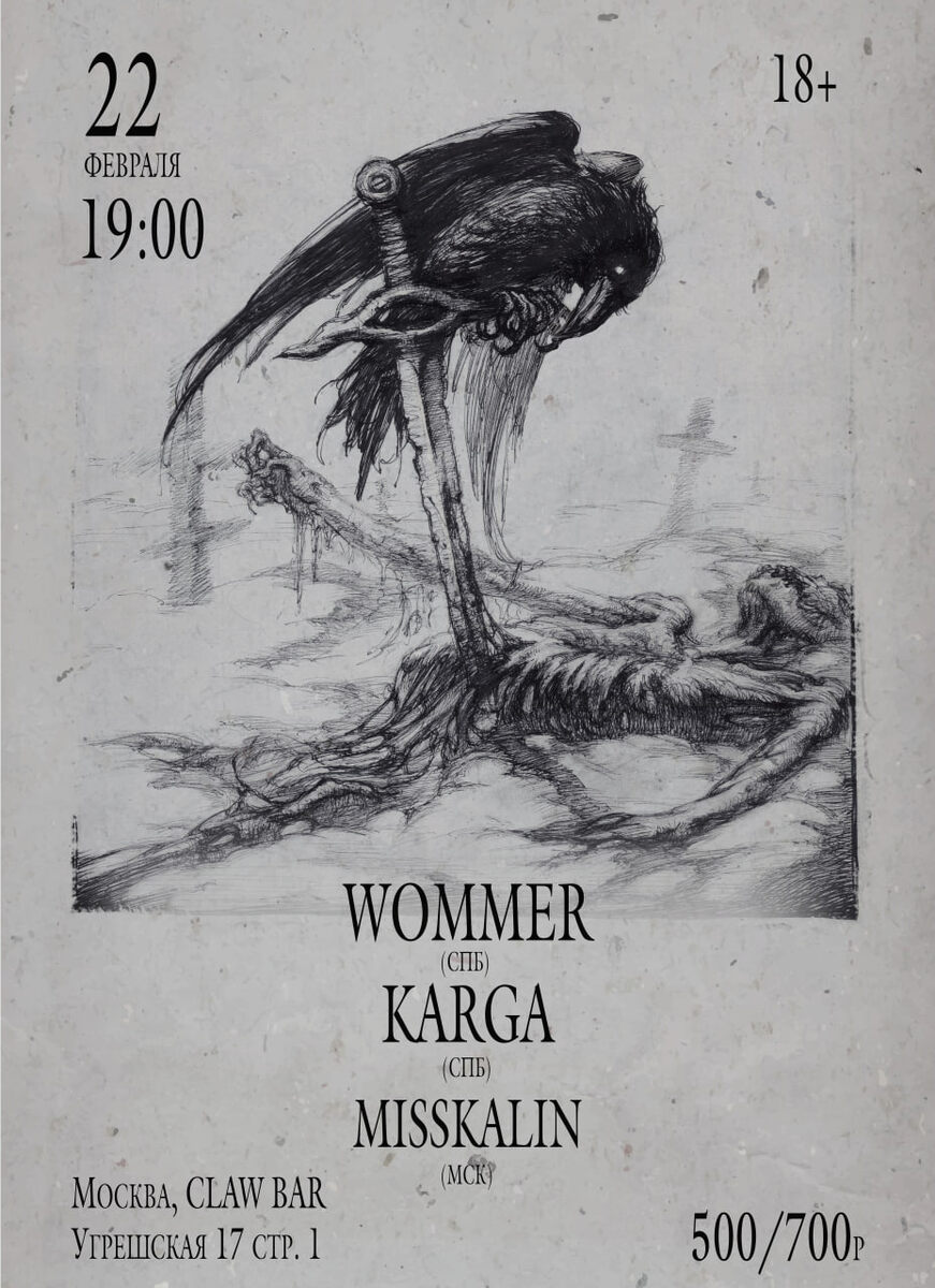 #doom #sludge ► MSK WOMMER/КАРГА WINTER TOUR 2026 ● VK Представители doom/sludge сцены Петербурга отправляются в тур по замерзшим землям, погружая всё в меланхолию и первобытную ярость! Участники: ► Wommer ● TG ● VK ► Карга ● TG ● VK ► missKalin ● VK Билеты от 500₽