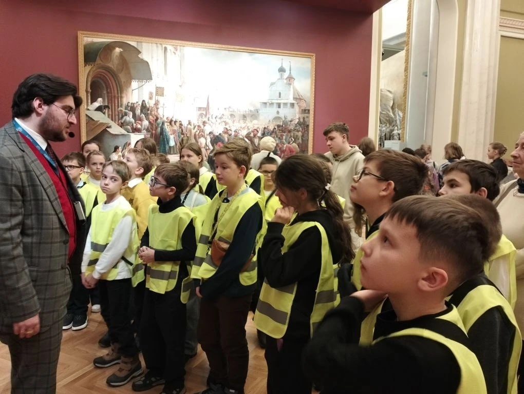 Рассказывает учитель младших классов Оксана Ивановна ФРОЛОВА Недавно ученики 4 "Г" класса посетили на ВДНХ выставку картин "Образ Москвы в русском искусстве из коллекции Государственного Русского музея". Там было представлено 115 шедевров русских мастеров. Их привезли из Санкт - Петербурга, объединив пространство культурных кодов двух столиц. Здесь ребята впервые увидели иконы Андрея Рублёва, признанные шедевры русских живописцев: "Святая Русь" Михаила Нестерова, "Степан Разин" Василия Сурикова, "Торжественное заседание Государственного совета" и " В осажденной Москве" Ильи Репина, "Портрет княгини Юсуповой" Валентина Серова. Экспозиция содержала 4 тематических раздела: "Старая Москва", "Москва - столица", "Новая Москва", "Москвичи". Экскурсовод очень эмоционально и интересно рассказал и об истории создания самого павильона N 1 и о картинах, размещенных на выставке. Дети много узнали на выставке и ушли с неё в полном восторге. Советуем всем туда сходить. !!! Дорогие наши подписч