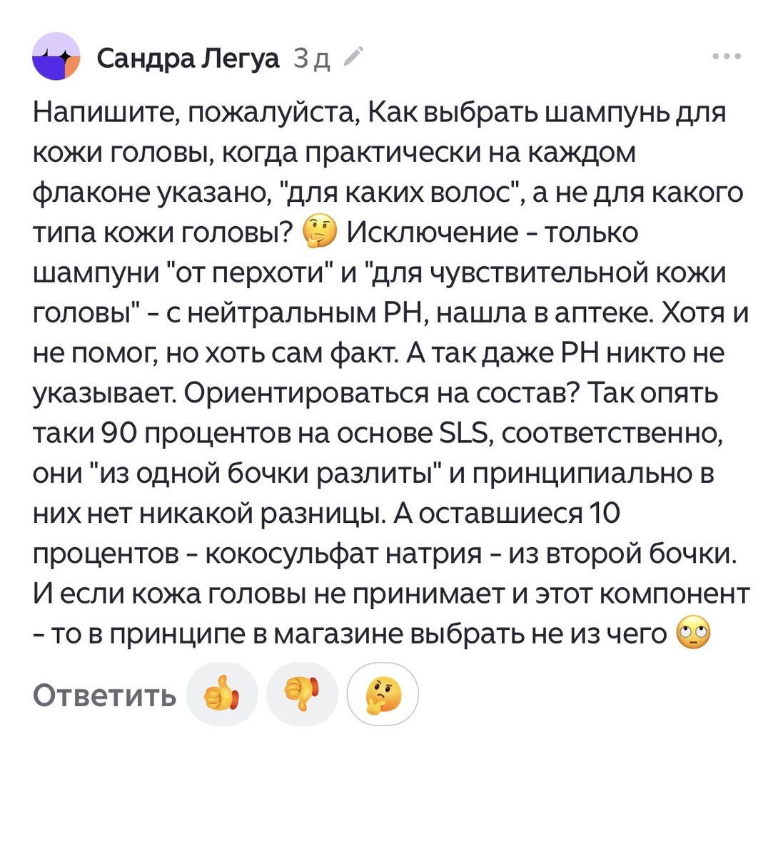 А у вас был опыт, когда шампунь подходил всем вокруг, а вашей коже головы категорически нет? Поделитесь в комментариях — это поможет другим не наступать на те же грабли.
