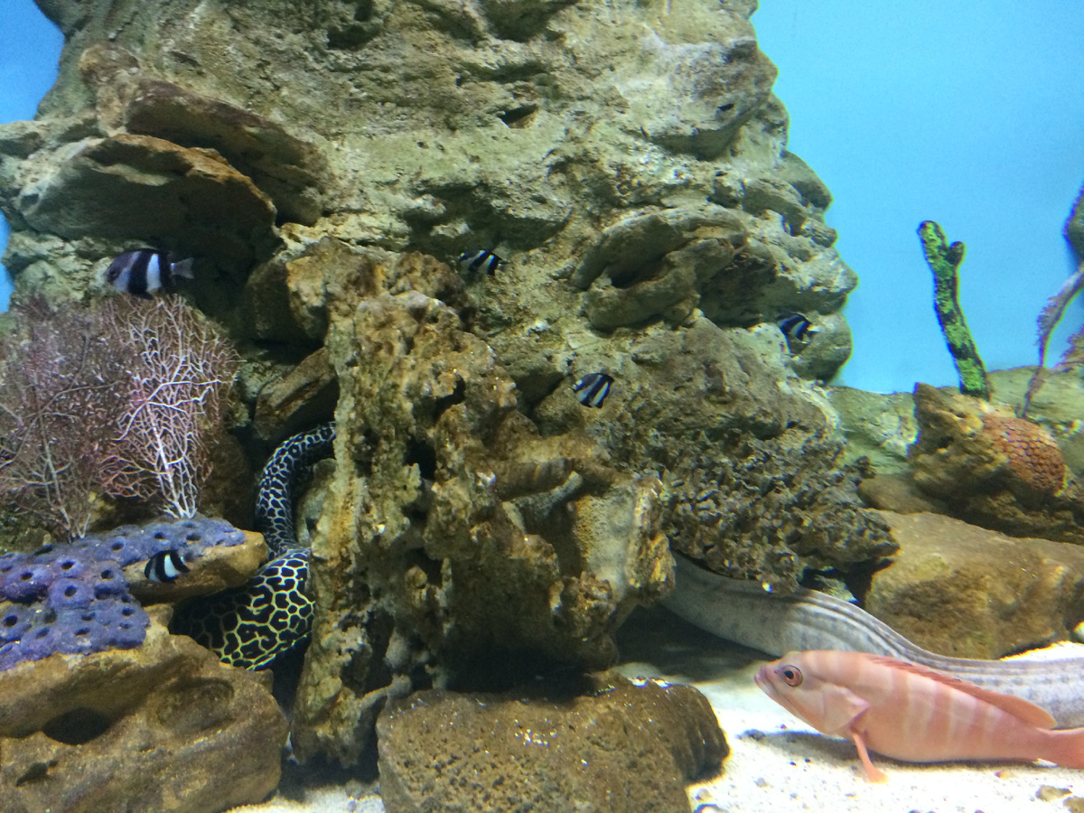 Посмотреть за обитателями тропических морей, можно и в океанариуме города Екатеринбурга! Там есть гардероб, он расположен на нижнем этаже. Очень актуален в зимнее время. Да да именно таких обитателей тропических морей вы можете увидеть в океанариуме. А вот так он выглядит со второго этажа. На втором этаже есть кафе откуда вы можете наблюдать за такими видами. Расслабляясь за чашкой чая или кофе с пироженкой. На этаже также есть туалет в него можно выйти и обратно зайти по штрих коду на билете. А вот в этом аквариуме расположился крокодил. Здесь так же представлены и пресноводные обитатели рек. Много здесь и маленьких аквариумов прогуливаться среди них одно удовольствие. Внимательно все изучайте не спешите. Здесь есть тоннель по которому вы можете пройти. А с этого балкончика который находится при входе, на втором этаже. Вы сможете сверху, понаблюдать за обитателями южных морей. Здесь есть и водолаз, который с удовольствием помашет вам и вашим детям, рукой в ответ. Ну куда же без