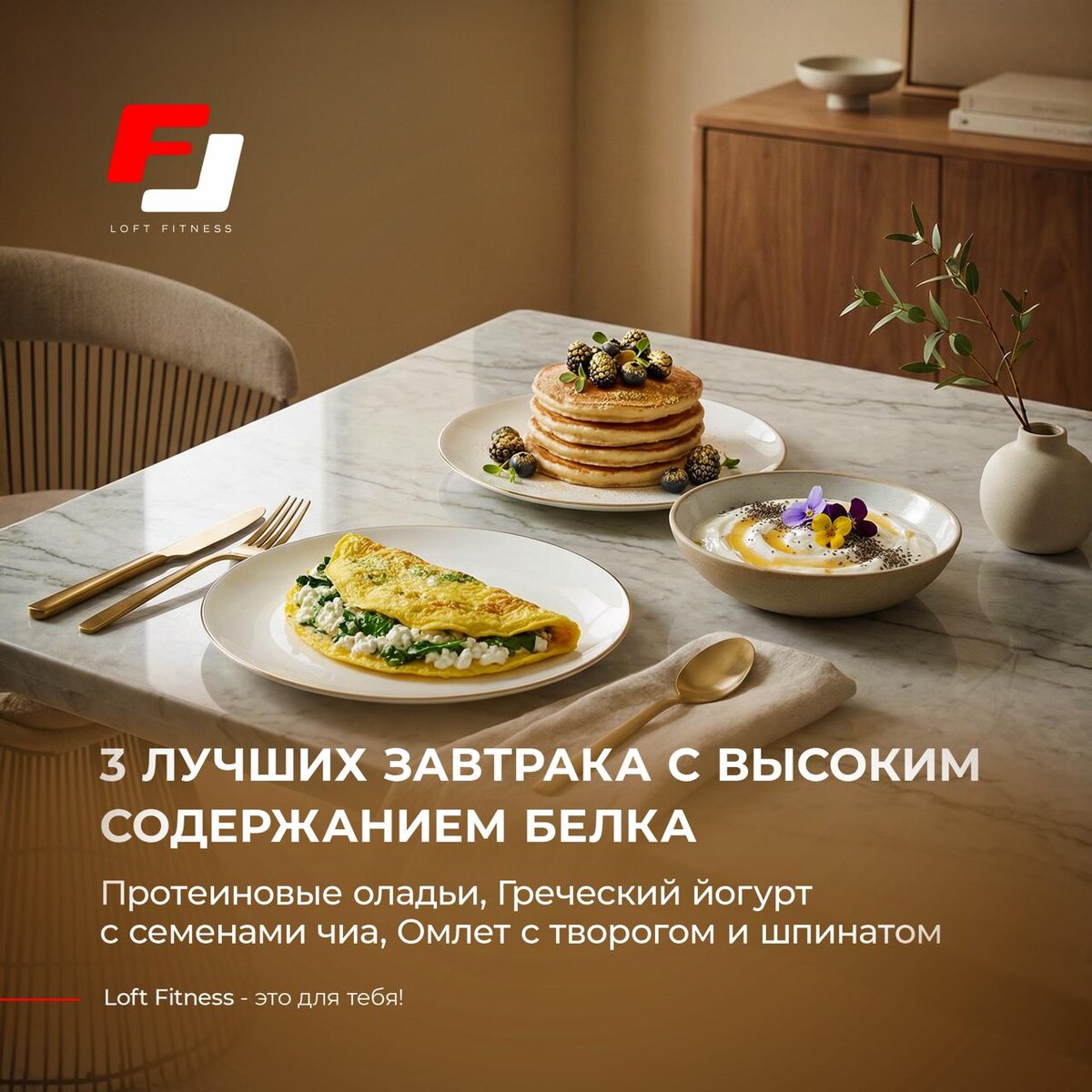 Мы знаем, как важно для тех, кто наращивает мышечную массу, поддерживать норму белка. Поэтому подготовили для вас 3 простых высокобелковых рецепта на завтрак: 1️⃣ Омлет с творогом и шпинатом Смешайте 2–3 яйца со 100 г зерненого творога. Обжарьте на сковороде с горстью свежего шпината. Творог при нагревании становится тягучим, как сыр, и значительно увеличивает содержание белка в блюде 🥬 *Примерно 25–30 г белка.* 2️⃣ Греческий йогурт с семенами чиа и миндалем Используйте натуральный греческий йогурт без сахара (в нем в два раза больше белка, чем в обычном). Добавьте столовую ложку семян чиа и 15–20 г миндаля. Для сладости можно добавить горсть ягод 😒 *Примерно 20–25 г белка.* 3️⃣ Протеиновые оладьи Смешайте один спелый банан, 2 яйца и 30 г протеинового порошка (или замените протеин на 100 г мягкого творога и пару столовых ложек овсяной муки). Обжарьте на антипригарной сковороде без масла 🧇 *Примерно 25–30 г белка.* Приятного аппетита! ❤️