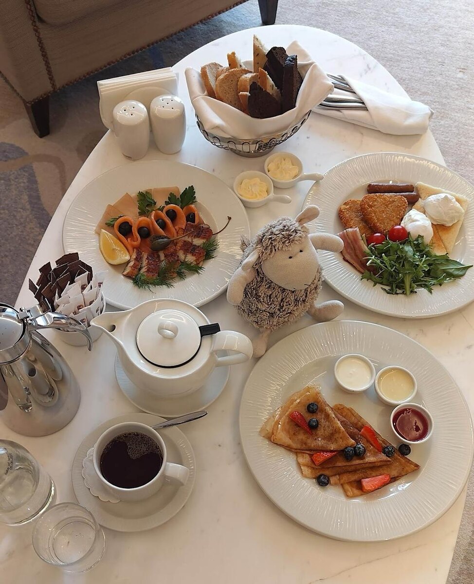 В таких случаях у Овцы Бориса один рабочий сценарий — не паниковать, а сразу звонить в рум-сервис. Завтрак приехал ровно в тот момент, когда мы закончили утренние банные процедуры. На столе в гостиной нашего люкса «Лотос» в Soluxe Hotel Moscow уже ждала классика позднего утра: блинчики с ягодами и добавками, яйца пашот с хрустящими тостами, свиные сосиски, драники, рыбная нарезка (лосось, угорь, масляная рыба) — тот самый баланс «и солёное, и сладкое», когда хочется всего и сразу. Плюс чайник, кофейник и хлебная корзина — идеальный набор, чтобы окончательно убедить себя, что план «проспали» на самом деле был гениальным. Овца Борис, кстати, первым делом ушёл в блины — Масленица же за окном. Сегодня ещё по плану дегустация в «Балчуге», а тренироваться критиковать надо заранее 😂 А мы в очередной раз зафиксировали: иногда лучший завтрак в отеле — это тот, на который ты вообще не собирался идти. Отличная незапланированная ночёвка — спасибо за гостеприимство, #soluxe!