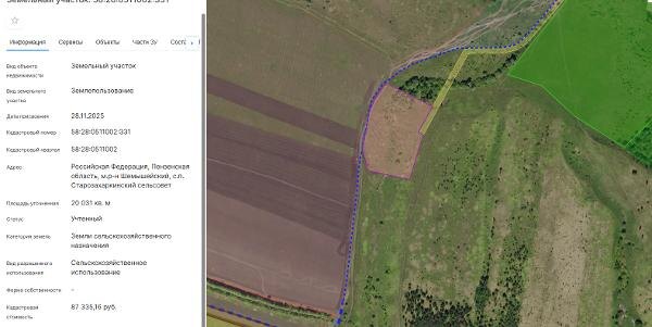 Название: Земельный участок, государственная собственность на который не разграничена, с кадастровым номером 58:28:0511002:331, общей площадью 20031 кв.м., категория земель - земли сельскохозяйственного назначения, с видом разрешенного использования – сельскохозяйственное использование, расположенный по адресу: Пензенская область, Шемышейский район, Старозахаркинский сельсовет. Канал: Госземля Пензенская область Область: обл Пензенская Район: м.р-н Шемышейский Населенный пункт: с.п. Старозахаркинский сельсовет Локация: Смотреть на карте ВРИ: Сельскохозяйственное использование Кадастровый номер: 58:28:0511002:331 Кадастровая стоимость: - Вид сделки: Аренда Площадь: 20031 м² Начальная цена: 6552.00 руб. Дата завершения: 04.03.2026 Подробнее: ГИС ТОРГИ #госземля #земляотгосударства #земля #земельныйучасток #земельныеторги #торги #аукцион #арендаземли #аренда #пензенскаяобласть