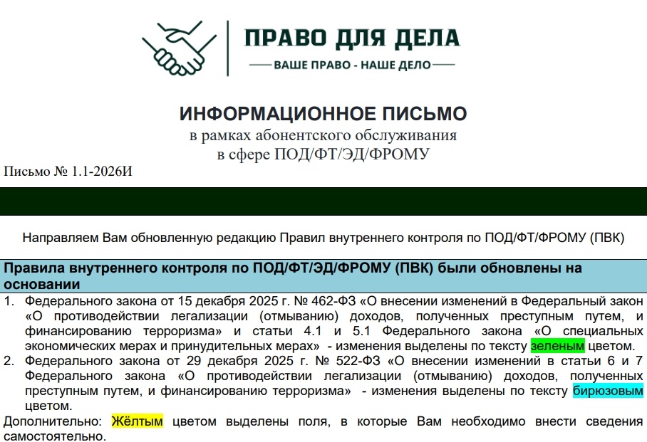 Третий рабочий день нового 2026 года, а уже необходимо обновлять документы в сфере ПОД/ФТ/ФРОМУ. В компании «Право для дела» активно ведется рассылка обновленных правил внутреннего контроля и иных документов (информационных писем, приказов) клиентам, заключившим договоры абонентского обслуживания в сфере ПОД/ФТ/ФРОМУ. До 14.01.2026 включительно риелторам необходимо внести изменения в ПВК в соответствии со следующими законами: Мы уже отправили информационные письма нашим клиентам: Присоединяйтесь к абонентскому обслуживанию, чтобы вовремя получать обновленные документы!