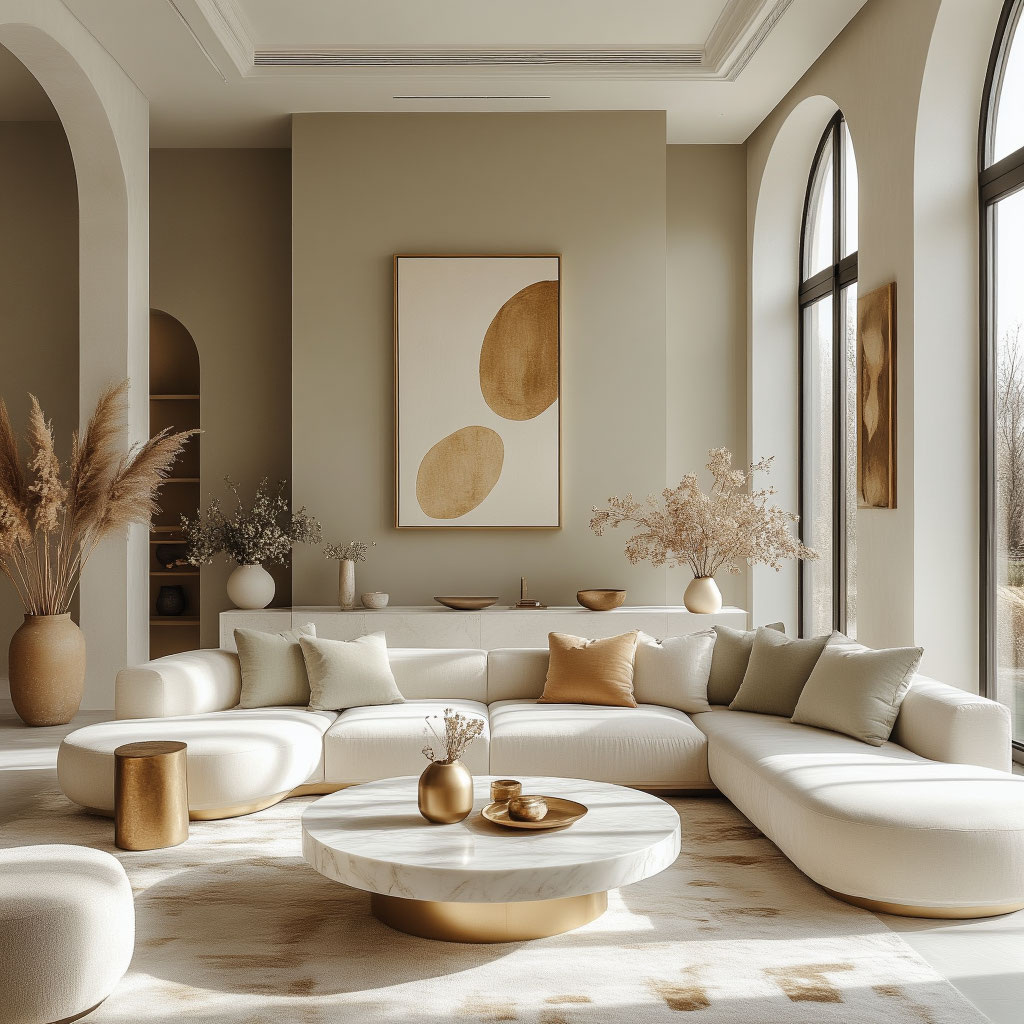 В гостиной цвет работает на создание гармоничного и гостеприимного пространства для общения и отдыха. Он может выступить как нейтральная основа для всего помещения, так и в роли цветового акцента в виде дивана, кресел или текстиля, задающего тон всей цветовой схеме.