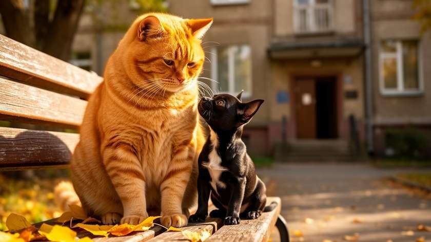Щенок тем временем освоился. Мы назвали его Лаки — за то, что повезло с Кузьмой. Он спал в кошачьей лежанке, ел из кошачьей миски и ходил хвостом за рыжим приёмным папашей. Кузьма относился к этому с достоинством. Иногда он даже играл с Лаки — толкал лапой тряпичную мышку и смотрел, как щенок носится за ней по комнате.