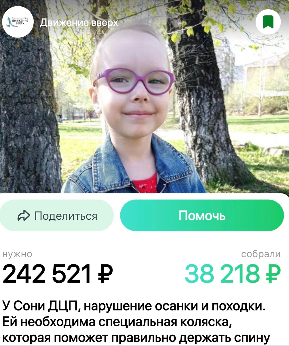 Ваша помощь очень нужна подопечному ребенку нашего фонда «Движение вверх» – Соне Науменко. Сбор средств осуществляется в приложении Tooba. Соня Науменко родилась в срок, крепкой и здоровой на вид, с хорошими показателями. Но гипоксия при родах привела к кровоизлияниям в том числе и в сосудистые сплетения мозга. В 1 год и 3 месяца прозвучал диагноз «ДЦП» (детский церебральный паралич), спастическая диплегия. Это значит, что все четыре конечности поражены спастикой – мышцы постоянно напряжены, скованы, не дают двигаться свободно. В 3,5 года Соне сделали сложнейшую операцию на спинном мозге – селективную дорсальную ризотомию. Теперь девочка может стоять без поддержки, ходить по дому (пусть иногда и падая), подниматься по лестнице, держась за перила, даже учится прыгать. Сейчас Соне необходима специальная коляска, которая поможет правильно держать спину, ставить ноги под нужным углом, чтобы не усугубить состояние здоровья. Помочь Соне можно по ссылке: https://m.tooba.com/d65b