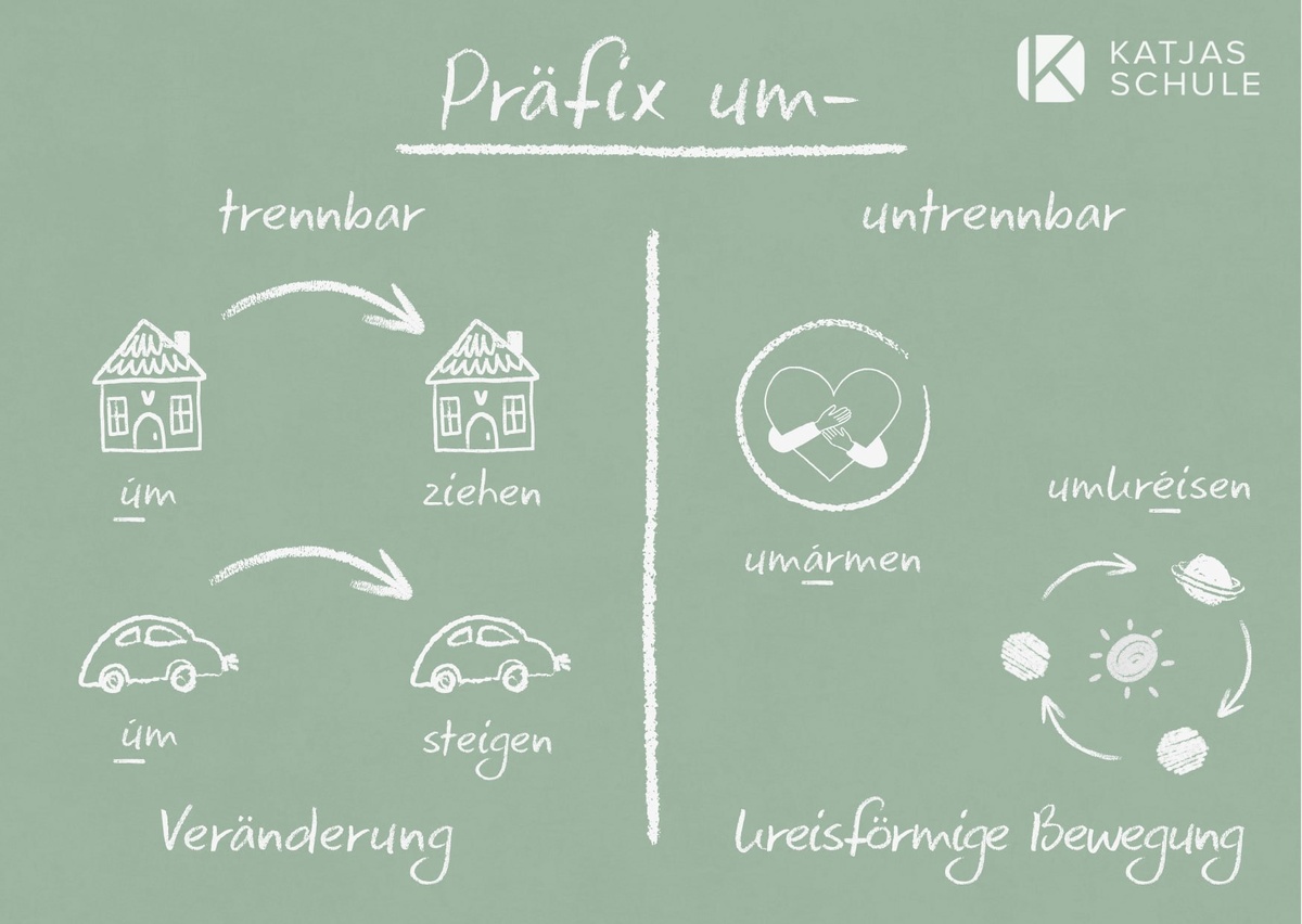 ? Первая приставка даже немного мемная за счёт пары глаголов úmfahren (отд.) и umfáhren (неотд.) От приставки буквально зависит, собьёт машина человека или нет! Смотрите: Das Auto fuhr einen Menschen um. – Машина сбила/переехала человека. Das Auto umfuhr einen Menschen. – Машина объехала человека. Как не запутаться? 1⃣ Если глагол связан с изменением состояния или местоположения, um- отделяется. úmfahren – переехать/сбить (был человек живой-здоровый – и вот сбитый машиной, изменение состояния) úmziehen – переехать в другое место (смена места жительства) úmsteigen – пересесть в другой вид транспорта úmstellen – переставить с места на место Чтобы запомнить, представьте себе картинку: вот глагол, вот приставка где-то далеко. Как два разных состояния! Или в случае с úmfahren: Er fuhr – 🤕(einen Menschen)🤕 – um. Глагол буквально разделился надвое несчастным сбитым человеком! 2️⃣ Если глагол показывает круговое движение, um- не отделяется. umfáhren – объехать вокруг umkréisen – круж